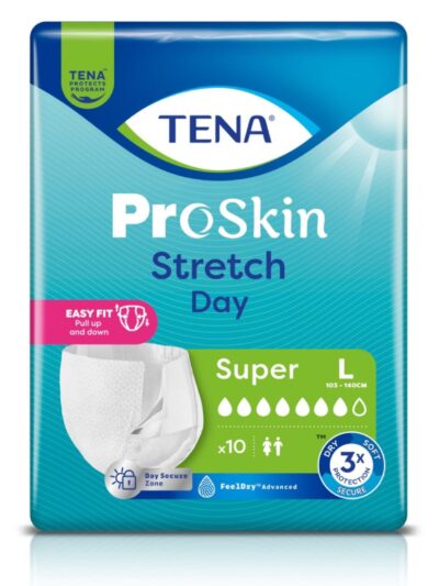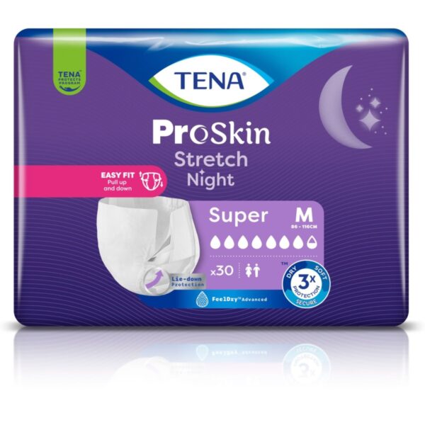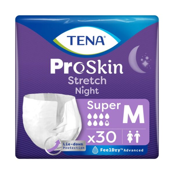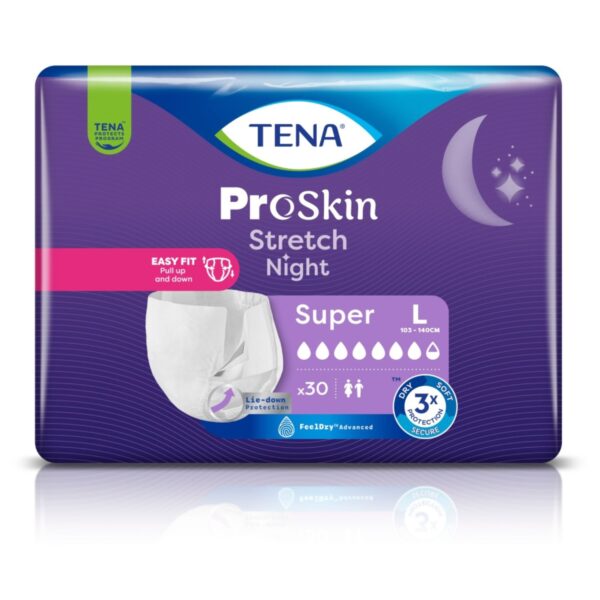 TENA Stretch ProSkin Night to nowoczesne pieluchomajtki jednorazowe stworzone specjalnie z myślą o ochronie w pozycji leżącej. Idealne dla osób z ograniczoną mobilnością oraz tych, którzy potrzebują niezawodnego zabezpieczenia podczas snu.